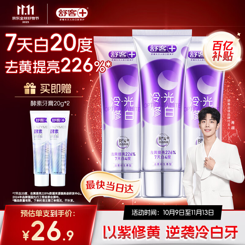 舒客色修美白牙膏清新亮白成人含氟去黄去渍减轻口臭110g*3紫色去牙渍