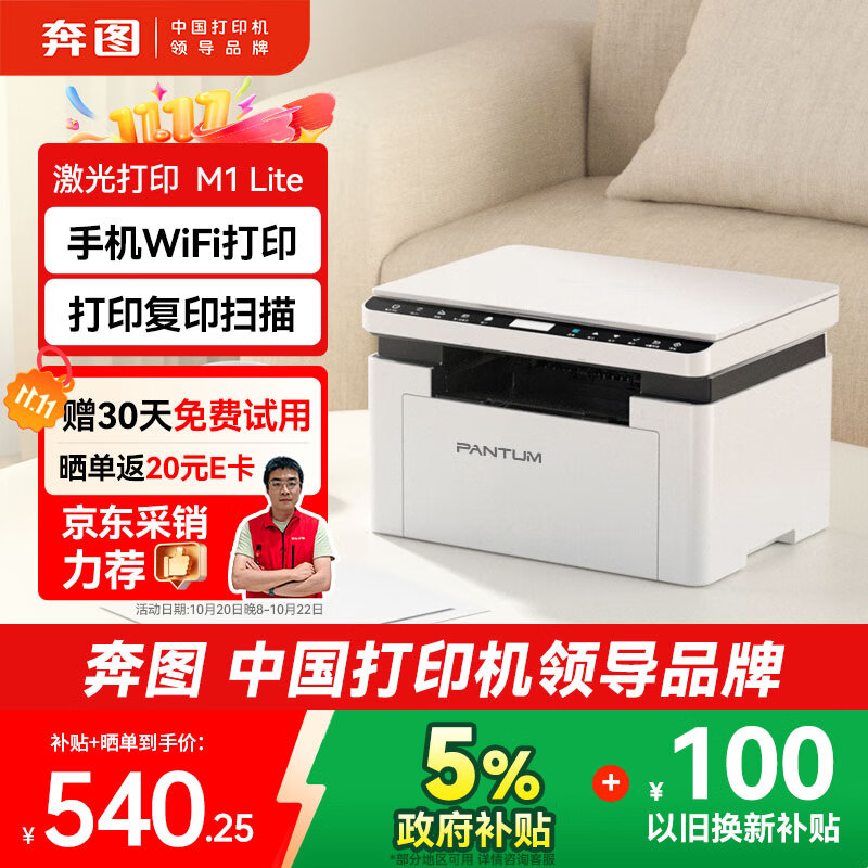 奔图(PANTUM)M1 lite激光打印机家用办公三合一 学生作业手机无线打印打卷子 办公室打印复印扫描一体机