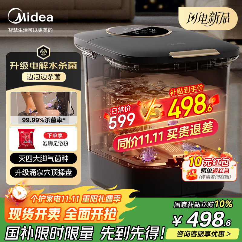 美的(Midea)泡脚桶足浴盆电解水杀菌加热自动按摩洗脚盆生日礼物送男女友长辈 ZL312海岩灰