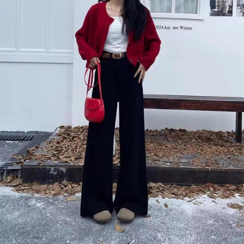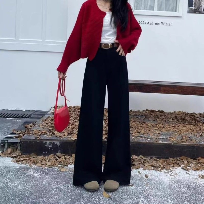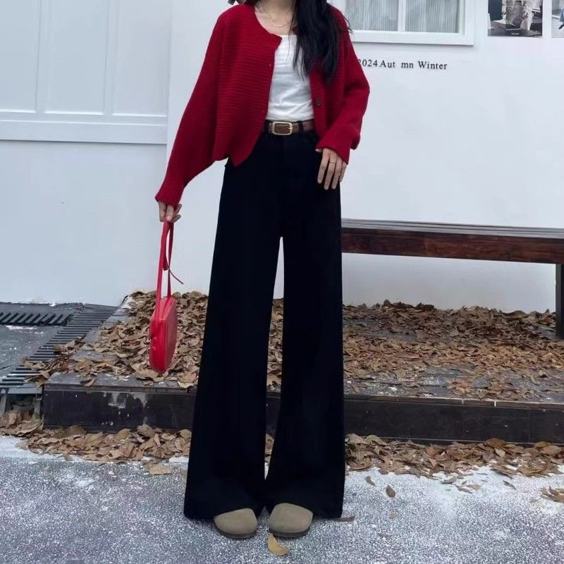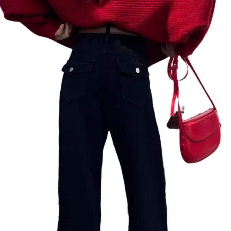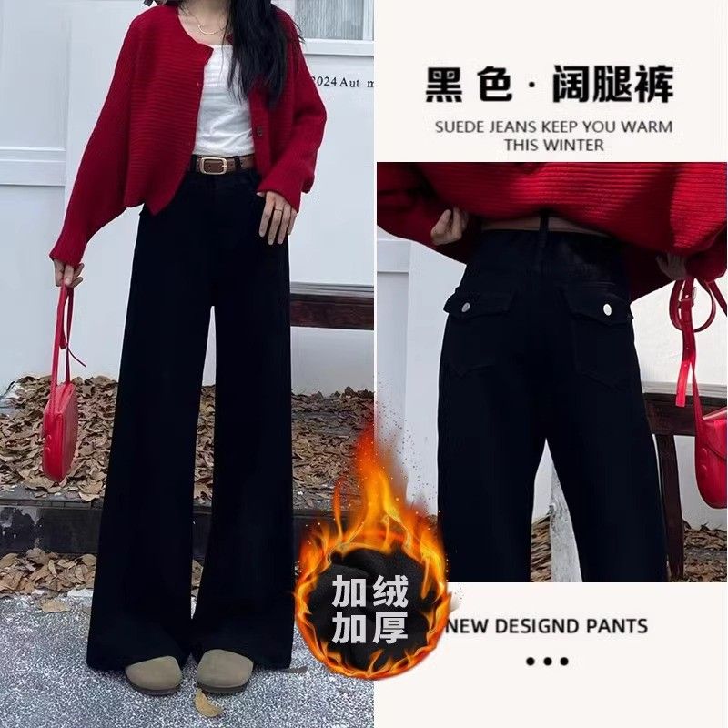 加绒加厚阔腿牛仔裤女冬季潮流百搭新款黑色高腰显瘦高街直筒长裤