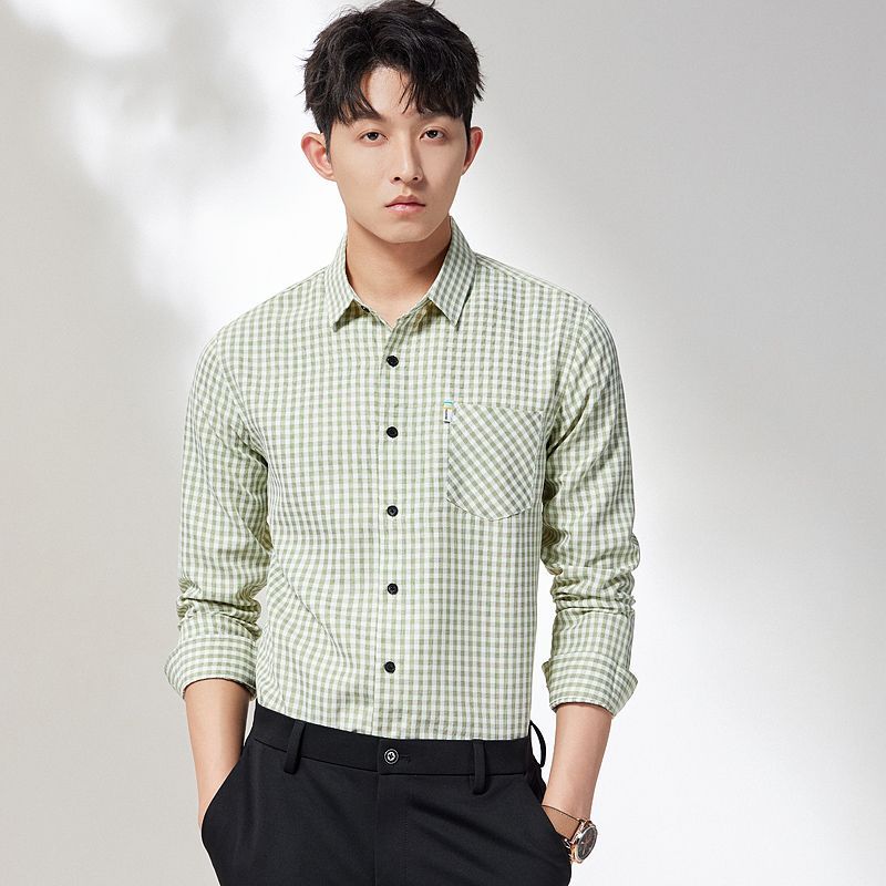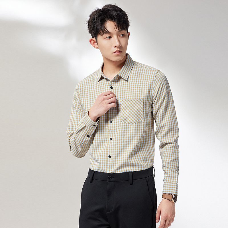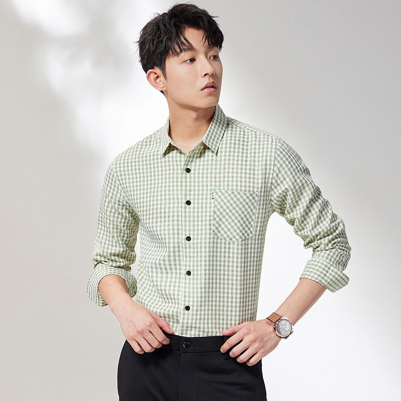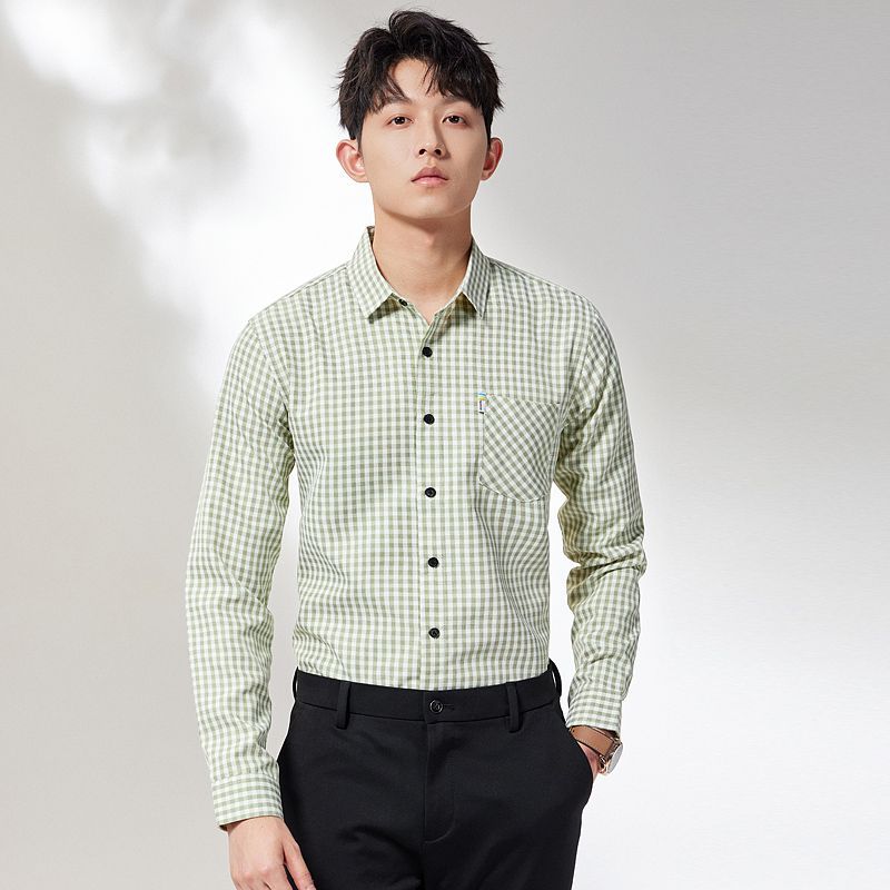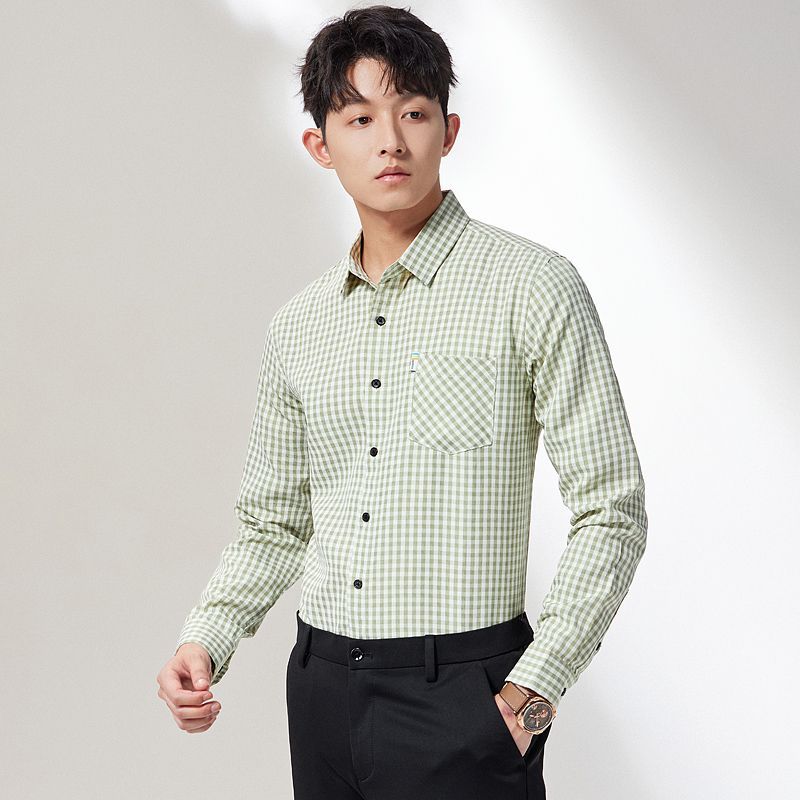汤尼俊士春秋款男士商务休闲格子长袖衬衣韩版修身潮流百搭衬衫男