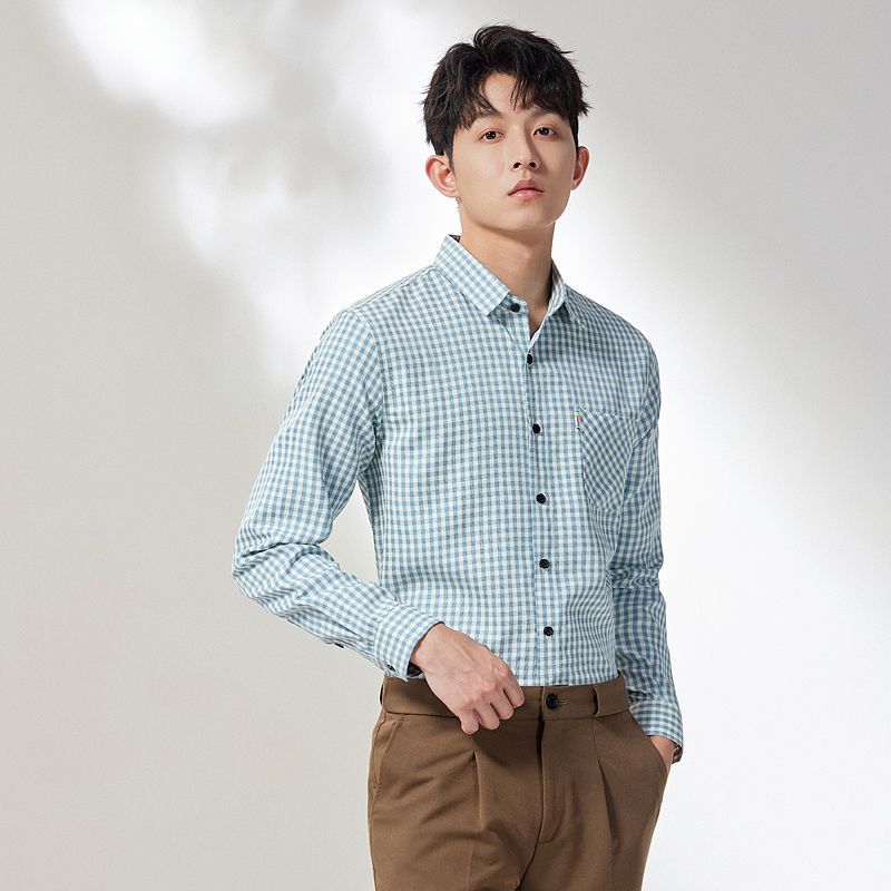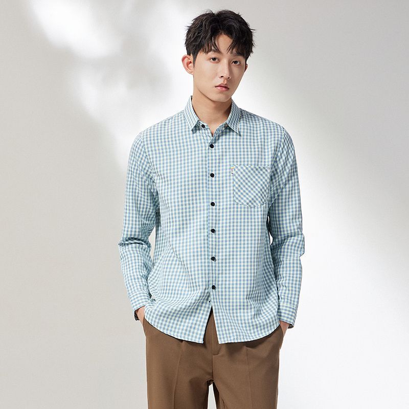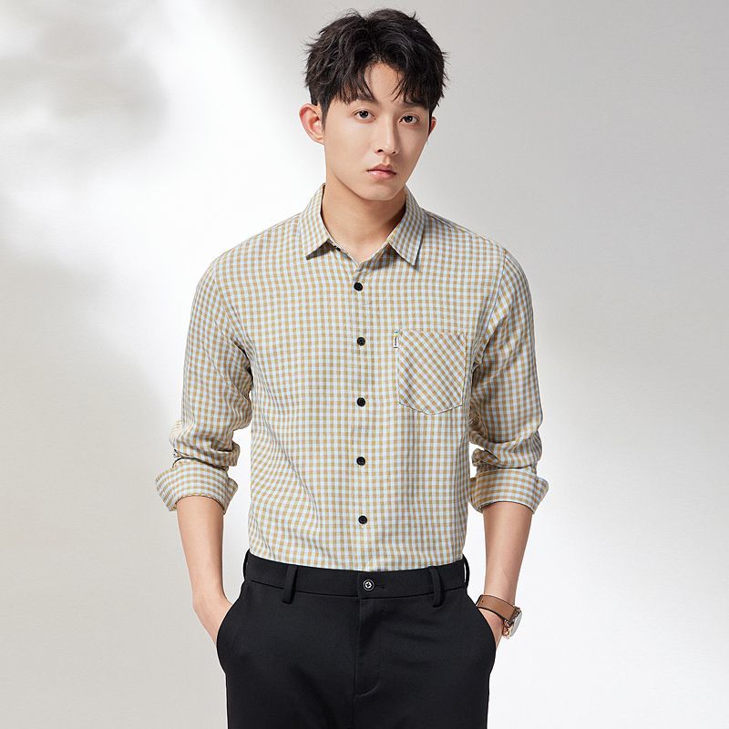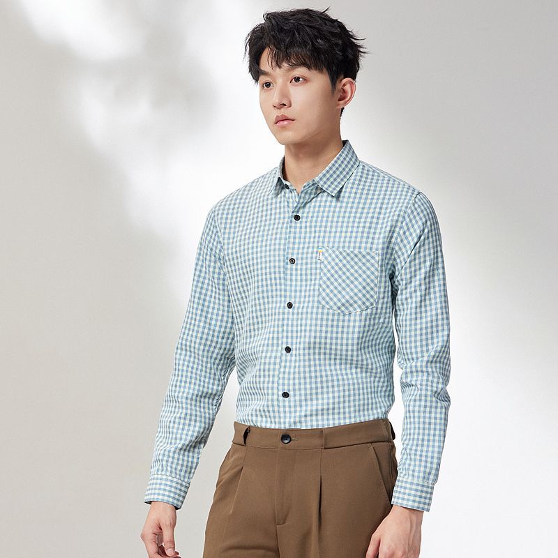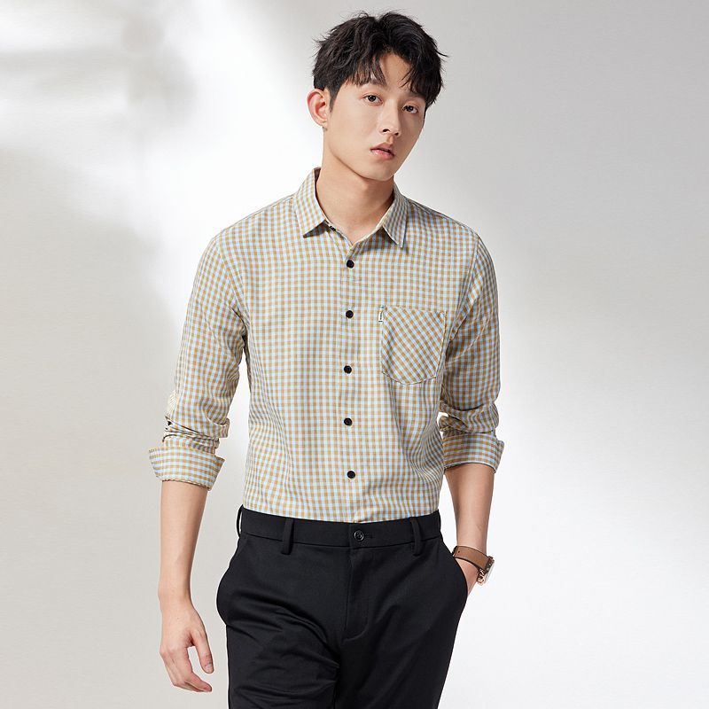 汤尼俊士春秋款男士商务休闲格子长袖衬衣韩版修身潮流百搭衬衫男