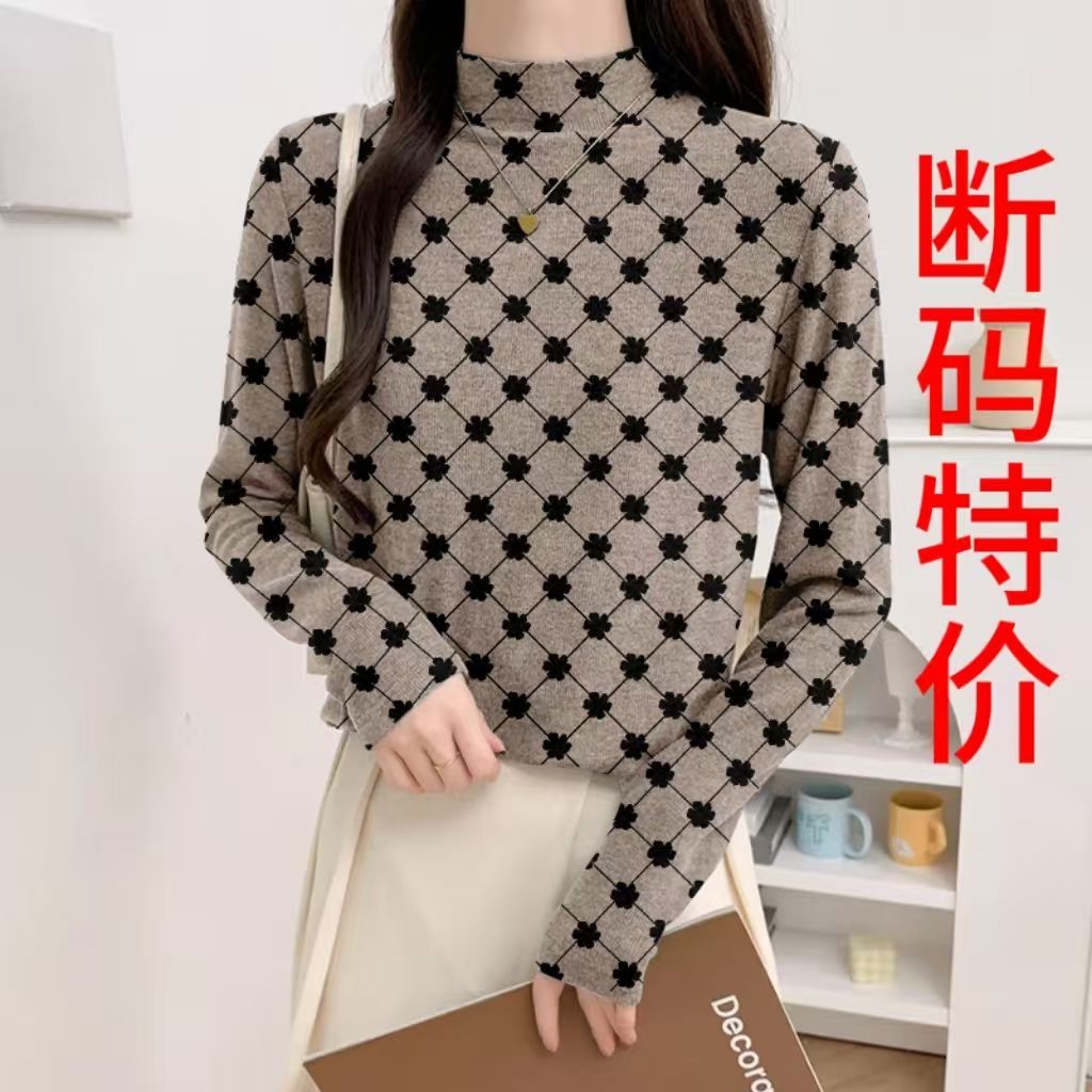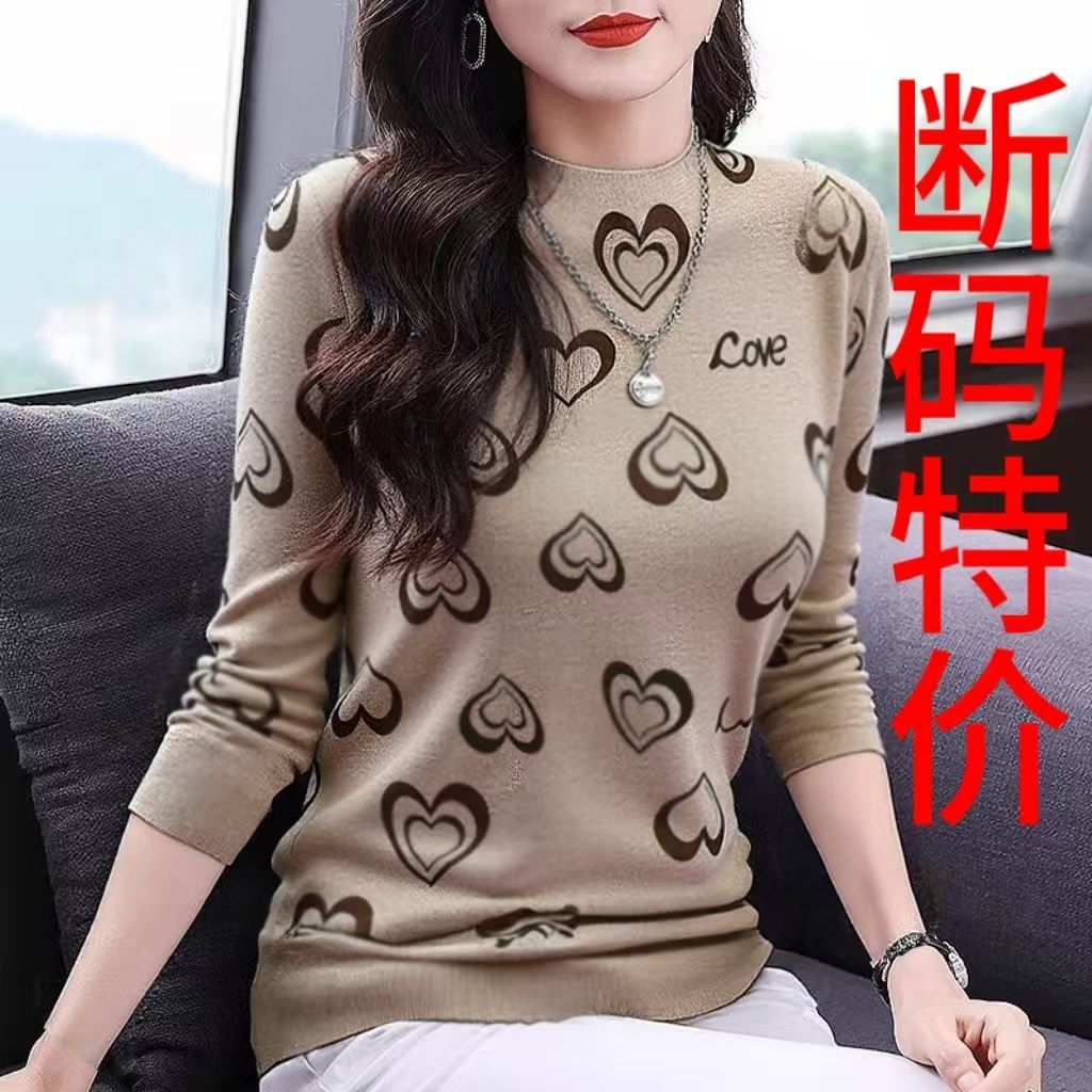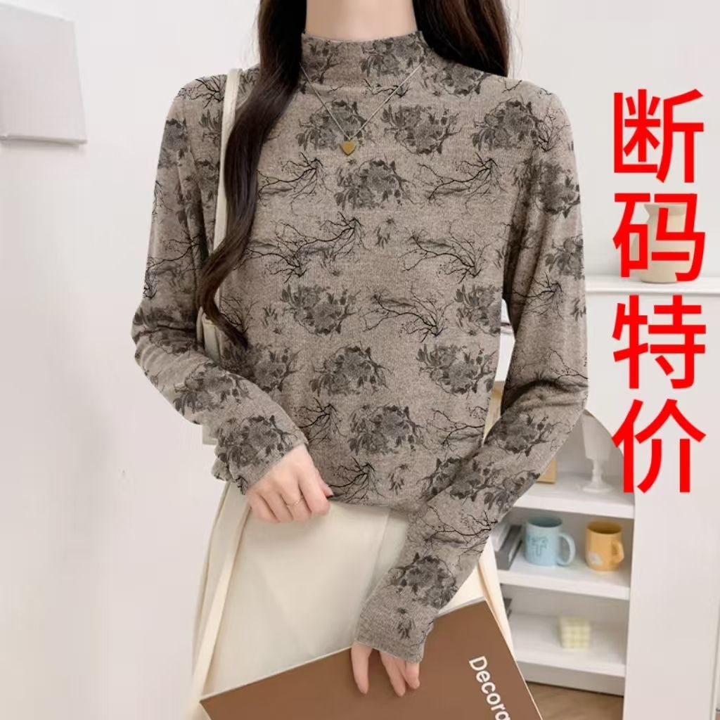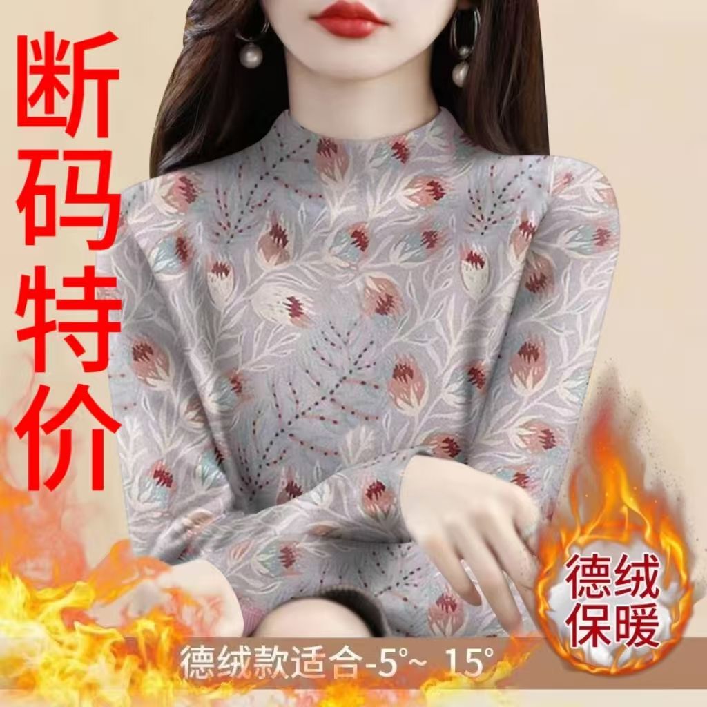 秋冬妈妈装双面德绒保暖印花T恤女新款半高领套头上衣宽松气质款【7天内发货】