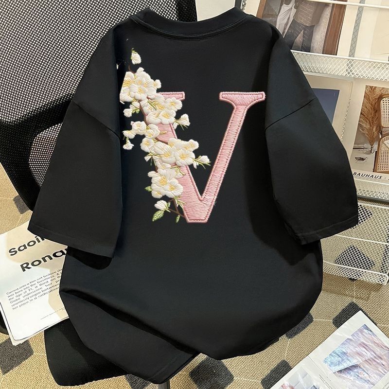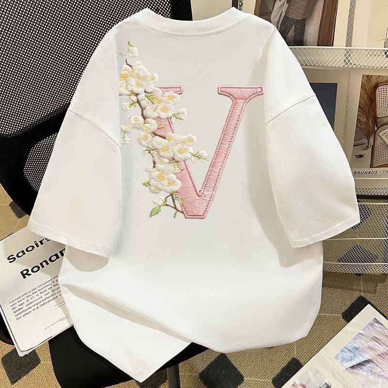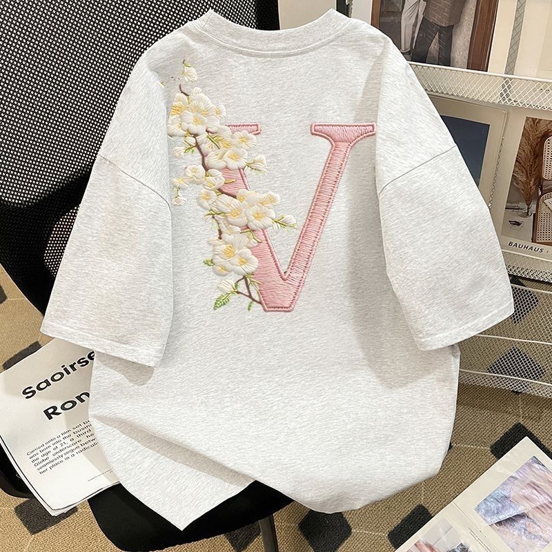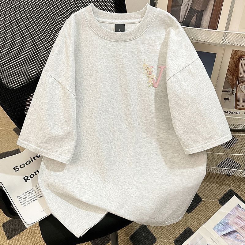 夏季美式vintage花朵字母印花仿刺绣短袖t恤男女百搭甜酷风上衣
